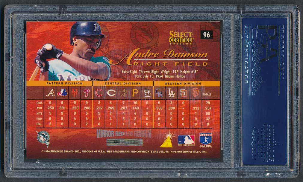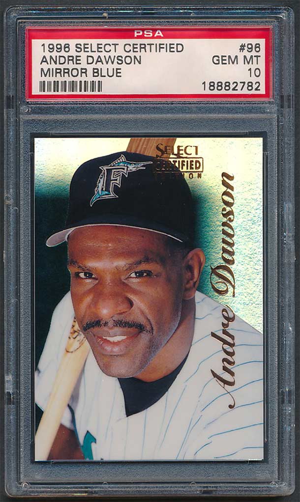 UPDATE: In February, 2026 several Mirror Gold PSA 10 examples of Dawson's card showed up on eBay with Buy It Now options - $999 for a Mirror Red, $1999 for a Mirror Blue, and $10,000 for a Mirror Gold. I submitted a couple offers lower then the asking price but they were not accepted. Within 10 days the auctions were ended. Suprisingly, the Red and Blue re-appeared as auctions with a starting price of $9.99 each. I ended up winning both cards for less than my initial offers so I was ecstatic. The Mirror Gold card is still available with a lower Buy It Now (still too high). But, maybe it will pop up as an auction item soon and I'll get a chance to purchase that one as well. So happy with these innagural / vintage "shiny" cards - some of the very first parallels in the hobby with substantially low print runs - /90 (Mirror Red), /45 (Mirror Blue), and /25 (Mirror Gold).