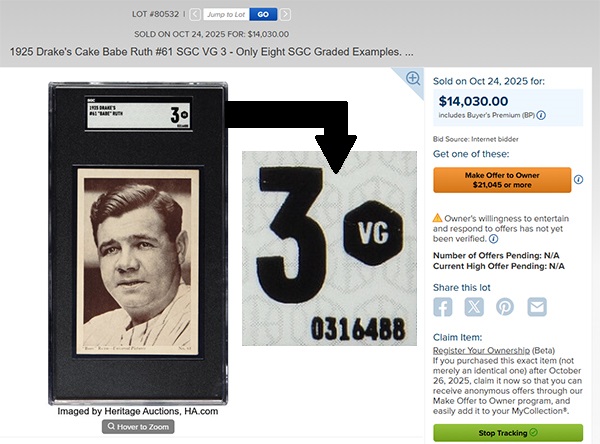 UPDATE: Occasionally I dream about owning some cards. Yes, I actually wake up remembering how an item slipped away from me when I could have easily owned it by clicking a button on a website. If I asked my immigrant parents (both born in Poland) to name one baseball player I really don’t think my Dad could name anybody. As far as my Mom goes, I’m fairly certain she’d say Baby Ruth (after the candy bar of course). In this case, a SGC 7 example with a “Yankee Cake” back showed up on eBay sometime before COVID (approx. 2018). I should have snagged it then because the price was reasonable ~$8500. The card had last sold in a Legendary Auction held November 28-29th, 2012, for much, much less ($4183 with juice):