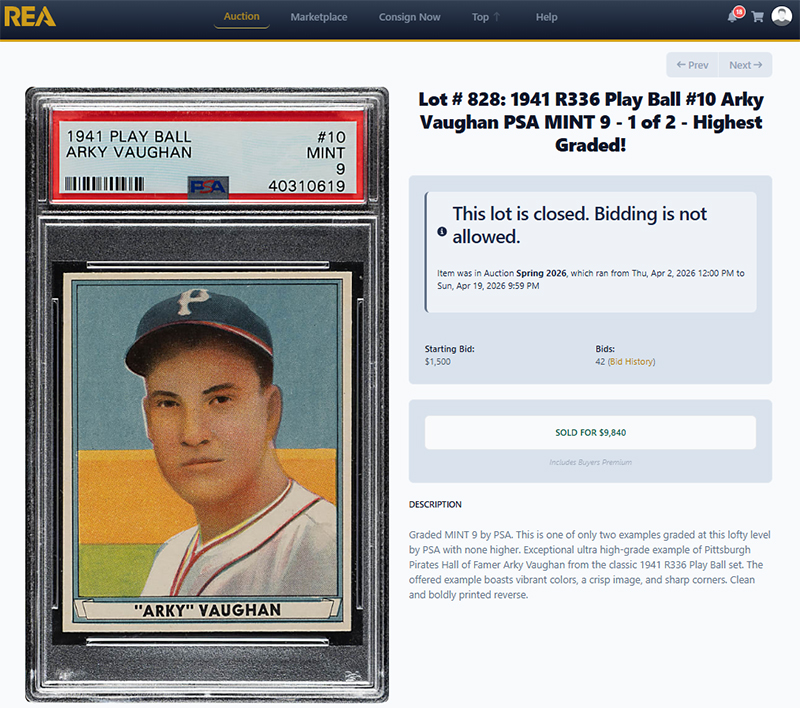 UPDATE: In the early morning hours of December 9th, 2016 I lay awake in bed watching the clock tick down on the Goodwin auction. Just a few days earlier I had received the catalog in the mail and found a 1941 PSA 8 example listed. Some snow or sticker remnants appeared on the players face/chin in the scan of the card posted online. In my opinion, this was a key reason nobody had placed the $200 minimum bid on the card with just 24 hours left in the auction. I went ahead and did so with the chance glue residue or scuffing was actually on the holder and not a flaw of the card. I doubted PSA would have missed this blemish and given straight numeric grade w/o qualifiers unless it was a truly nice card. I convinced myself it wasn't a card issue. One other bidder agreed on the final day of the auction and outbid me. Once the auction entered extended bidding it was head-to-head between just the two of us. Nobody else would be allowed to post bids since the rules forbid new action entrants during extended bidding. I placed one final bid around 11pm. I stayed up until 3:15am monitoring the item to ensure I wasn't outbid but fell asleep. A few hours later, exhausted, my kids playing woke me up and I checked the auction again. I was the winner! At that point I called the auction house, out of curiosity, and asked them to pull the card and verify the condition. Indeed, the scuffing was on the holder and my gamble had paid off. It was just a very poor picture online and not a true reflection of the clean, NM-MT perfection of the card. Here's the way the card appeared online: