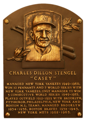 | A good outfielder, Stengel's two homers in the 1923 World Series helped the Giants beat the Yankees. As manager of Brooklyn and Boston, he earned a reputation as an entertaining, if not very effective, skipper. His creative use of the language, dubbed "Stengelese," made him a fan favorite. Named Yankee manager in 1949, "The Old Professor" won 10 pennants in 12 years, plus seven world championships. He had a career 1,905-1,842 record. |