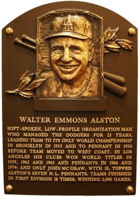 | "Smokey" Alston struck out in his only big league at-bat.In 23 years at the helm of the Dodgers, however, all under one-year contracts, Alston led the club to seven pennants and four world championships. Under his patient leadership, the Dodgers made pitching and defense a winning combination. His career record is 2,040 wins and 1,613 losses for a .558 winning percentage. |