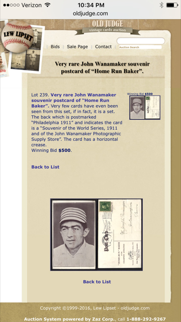 I wasn't actively looking to replace it with anything until I received the 2016 REA Fall auction preview announcement. The auction offered a 1911 Wanamaker Home Run Baker postcard graded SGC 45 and I had never seen it before. It was an amazing portrait, perfect for my collection. Auction day happened to be my son's 5th b-day yesterday, so I wasn't going to let this "souvenir" get away. The auction ended on a Sunday and extended bidding lasted most of the evening. I was outbid several times, and each time i bumped the bid back in my favor. When the final hammer hit just before 10pm MST, my last bid held up and I was declared the winner. The auction described the item as a 1:1. I didn't research it any further until after it was won. One other example turned up in my Google search, a used postcard with a US postage stamp on the reverse. The PR-FR example had sold only four years prior in a Lew Lipset auction and I missed it. Here's the listing...