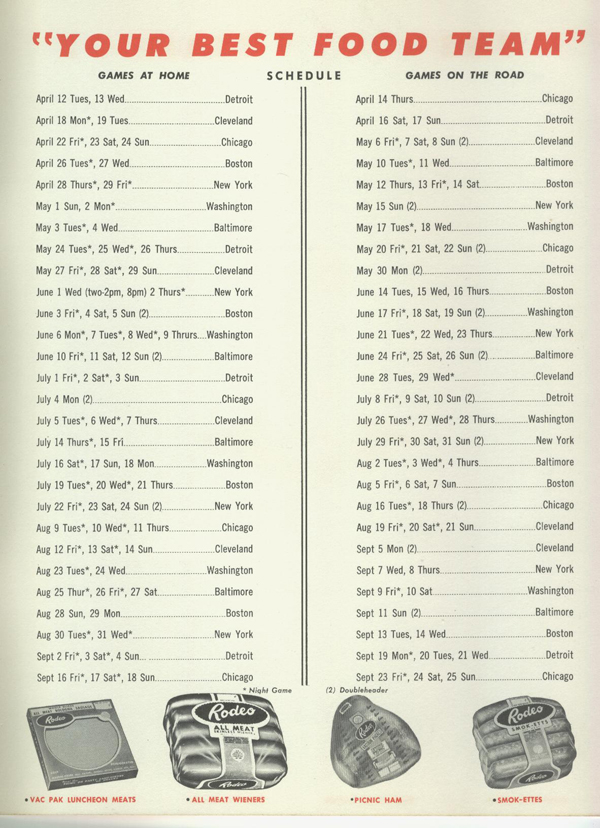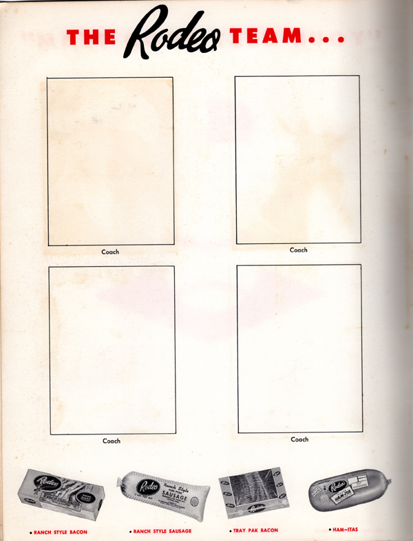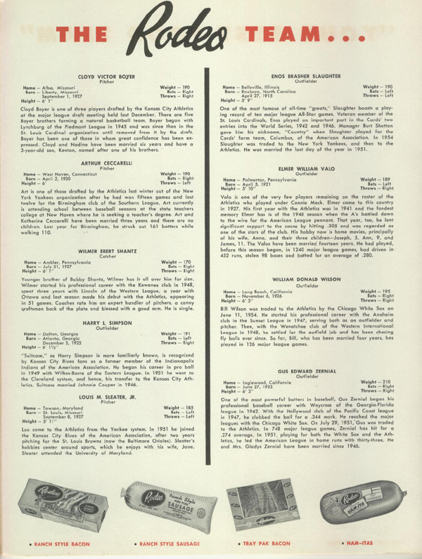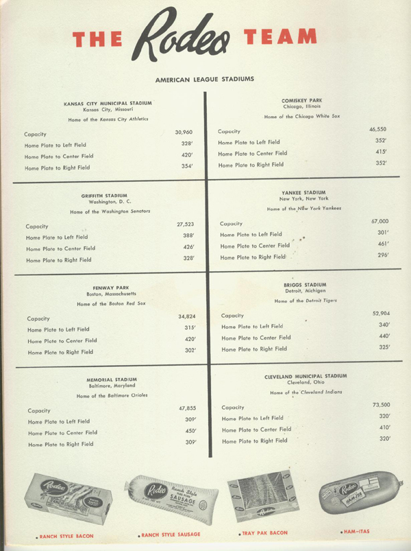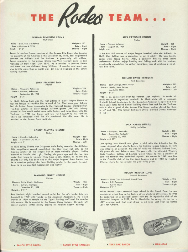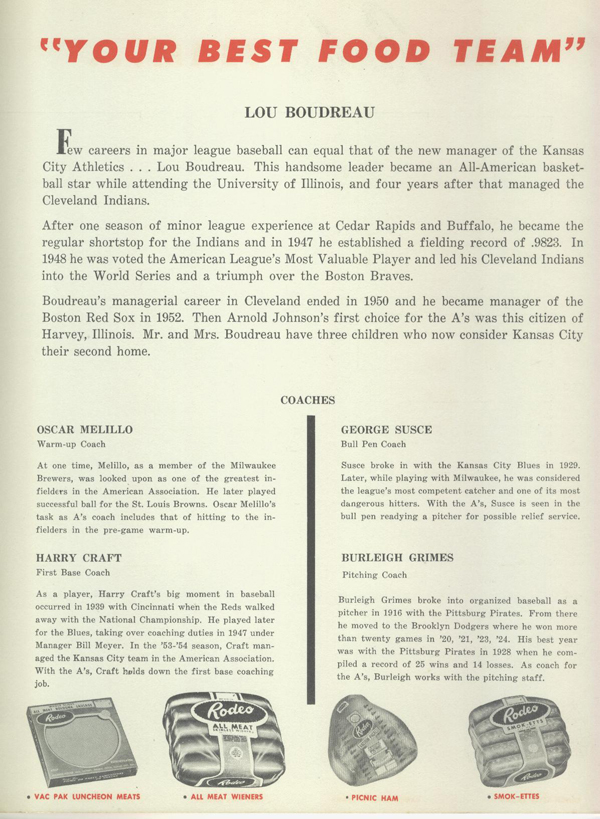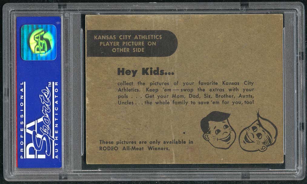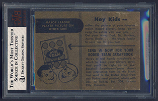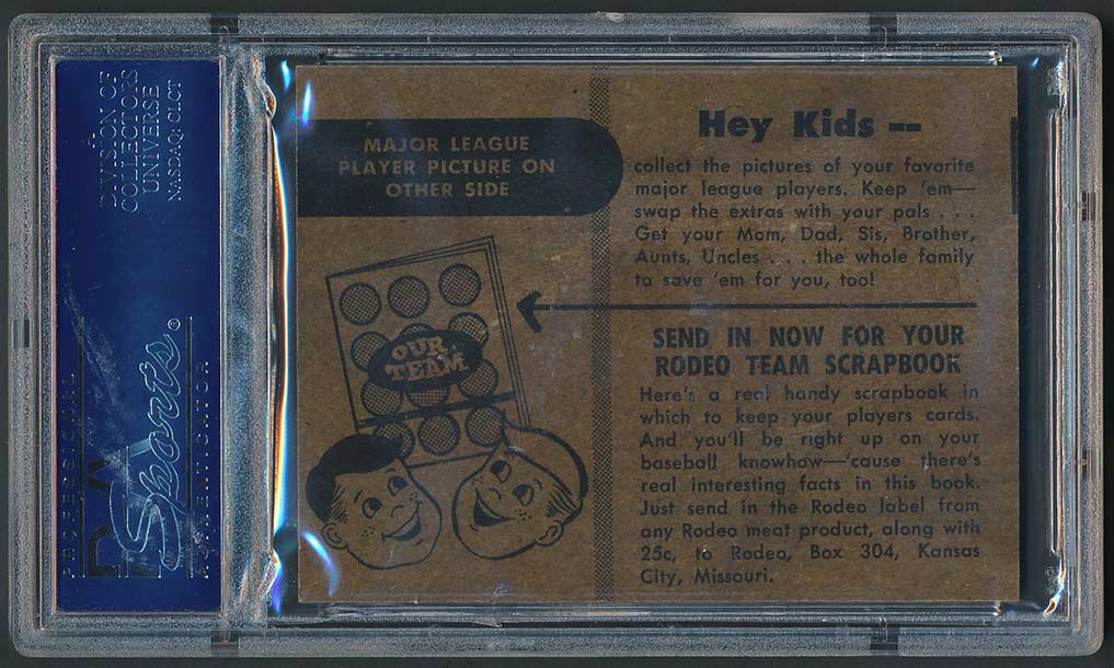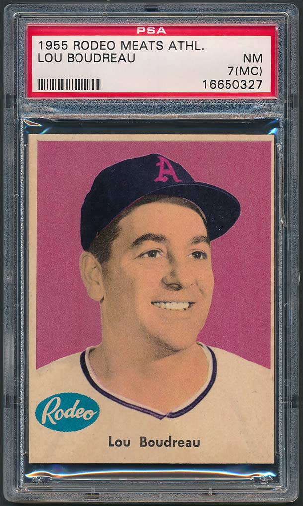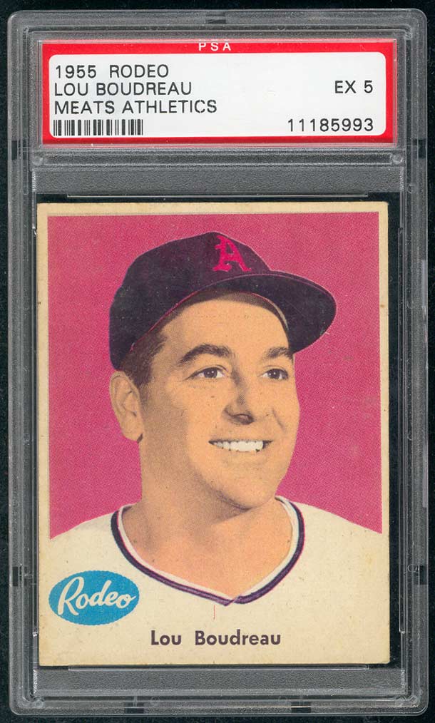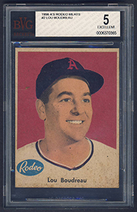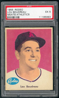 | Comments: A 1951 Bowman was my first portrait card of Lou  Boudreau. I purchased the card in November, 2002. That same month, I replaced  it with a 1956 Rodeo Meats because I liked the image a lot more. It was  submitted to PSA and came back GOOD 2. One of my friends in the hobby, Marty  Pritchard, sold me a PSA 5 upgrade in January, 2003. You just don't see them  any nicer than this. This card is actually a 1956 version and PSA mislabeled  the holder. It is the highest graded example to date with slight corner wear  and some staining. I've been looking for an upgrade ever since and have had  zero luck. UPDATE: In  September, 2015 I received an email from a gentlemen looking to sell his 1955  Rodeo Meats Boudreau card. His asking price was a little high. I had the '56  version and thought it would be fun to add the inaugural issue to my  collection. The seller was traveling to Colorado later in the week so we  decided to meet in person. I made an offer and the card was mine. I was happy to add  the card to show the difference on the  backs - album advertisement. Here it is: UPDATE: I’ve had an eBay search looking for “Rodeo  Meats” saved to my account for what seems like ages.  It’s rare for  anything to come up in decent shape.  Then, in December, 2021 my quest  turned up a 1955 PSA 7 (MC) example on eBay.  I was able to reach the  seller and we came to an agreement on a sale.  It was a great upgrade to  my BVG 5 example with less staining, and nicer corners. |