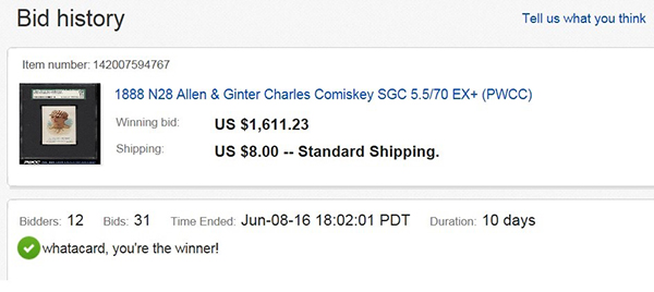 UPDATE: In June, 2016 I found a potential Comiskey upgrade and eyeballed the auction daily until 6/8, the last night of the auction. The card looked sharp with good color and the price was comparable to values listed in the SMR for the grade. Here’s the screenshot with 30 seconds to go and my bid amount…