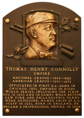 | Although born in England, Tom Connolly fell in love with baseball as a teenager and became an NL umpire in 1898. Frustrated with the circuit by 1900, he signed on to the AL in 1901. Thirty years later he was named chief of AL umpires, his position for another 23 years. Connolly and Bill Klem became the first umpires named to the Hall of Fame, in 1953. Connolly umpired in eight World Series, including the first in 1903. |