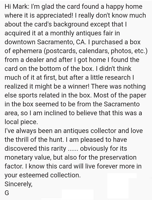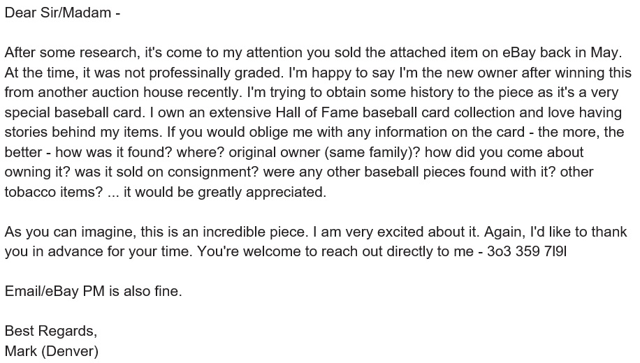After the auction, I reached out to REA, and learned the card was originally offered RAW via eBay back in May, 2019. There was a thread about the auction posted on Net54. I tried finding the auction via the eBay site but had no luck since the 90-day limit was exceeded. I called eBay directly, and to my surprise, their Customer Service department was incredibly helpful in helping me track down the original seller of the card. They wouldn't provide me with their ID, but they pointed me in the direction of another item they had listed. Using the eBay contact tool, I reached out with a private message on 8/22/19: