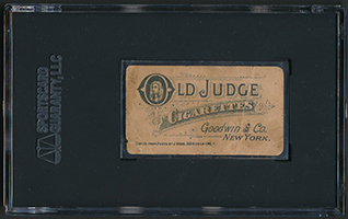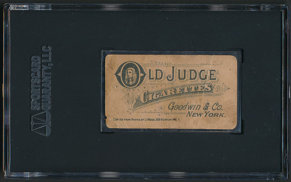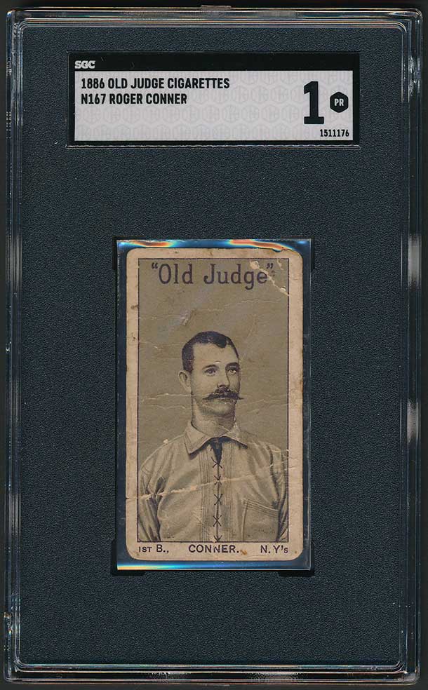 Here’s the auction description: “Rare and extremely desirable example of Hall of Famer Roger Connor from the 1886 N167 Old Judge series. As detailed in the May 2013 article on N167 Old Judges in Old Cardboard magazine, while this set has always been identified as being issued early in 1886, it is very possible (in fact, we think a virtual certainty) that the N167 set actually dates from 1885. Few nineteenth-century cards compare in rarity or significance to N167 Old Judges. These cards represent the very first series of baseball cards ever issued by Old Judge and feature photogravure portraits based on photographs by Joseph Wood. In addition to their very distinctive look, they are also the only Old Judge series to feature advertising on the reverse. The thin stock on which N167s are printed makes them especially susceptible to tears and other damage. The card is graded PR 1 by SGC (submitted by REA) due to heavy creasing across the card, even rounding to the corners and minor edge wear along the top. The important image of Connor, however, is bold and crisp. The reverse, one of the most ornately designed of the era, is free of paper loss and displays only the previously mentioned creasing and light soiling. As the first card of Connor issued by Old Judge, this card would also, by definition, qualify as his rookie card for most collectors. In addition to their enormous significance as the very first tobacco baseball card set, N167 Old Judges have always been recognized as extremely rare. The numbers speak for themselves: To date, only fifty-three examples from the series have ever been graded by PSA or SGC, including nine Connor examples, and we believe this number may actually be slightly inflated due to cards being crossed over from one company to another. Whatever the true number, N167s are rare! This is an outstanding example of the legendary Roger Connor from one of the most condition-sensitive, important, and rarest issues in all of card collecting.”
