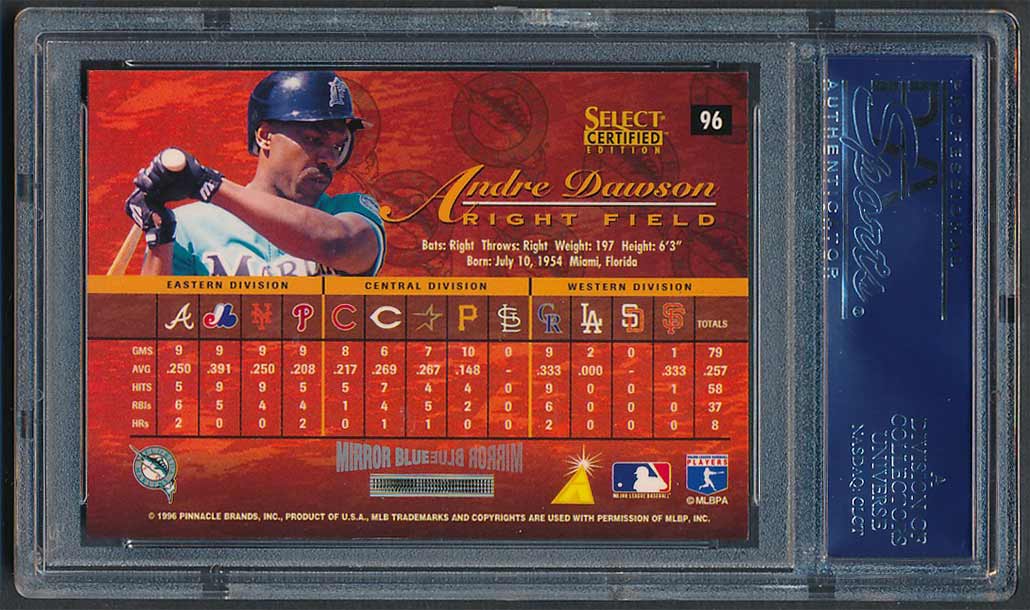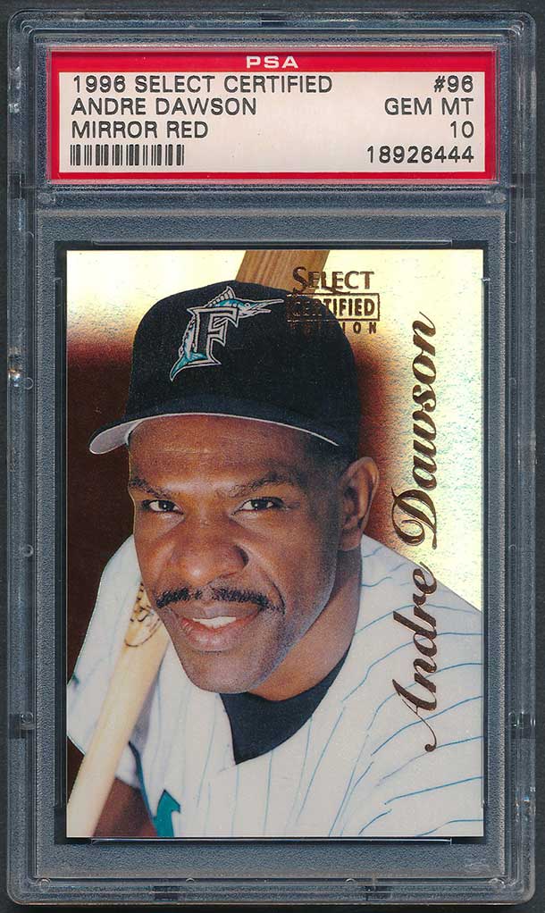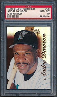 UPDATE: In February, 2026 several Mirror Gold PSA 10 examples of Dawson's card showed up on eBay with Buy It Now options - $999 for a Mirror Red, $1999 for a Mirror Blue, and $10,000 for a Mirror Gold. I submitted a couple offers lower then the asking price but they were not accepted. Within 10 days the auctions were ended. Suprisingly, the Red and Blue re-appeared as auctions with a starting price of $9.99 each. I ended up winning both cards for less than my initial offers so I was ecstatic. The Mirror Gold card is still available with a lower Buy It Now (still too high). But, maybe it will pop up as an auction item soon and I'll get a chance to purchase that one as well. So happy with these innagural / vintage "shiny" cards - some of the very first parallels in the hobby with substantially low print runs - /90 (Mirror Red), /45 (Mirror Blue), and /25 (Mirror Gold).
