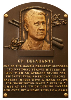 Currently, SGC lists only 7 encapsulated  Delahanty's with PSA listing only a single "VG/EX 4" specimen. While  that total "8" count confirms its ultra-rarity, even more impressive  is that this extraordinary VG/EX offering just happens to share the spotlight  with the aforementioned PSA 4 Delahanty as the HIGHEST GRADED example on the  planet! So why is this Delahanty cabinet coveted by a hoard of 19th century  enthusiasts? First & foremost, it represents the incomparable "Big  Ed" who just might reside as the most coveted 19th century Hall of Famer  (with all due respect to Cap Anson and Buck Ewing). In 15 seasons+, Delahanty  accumulated 2,597 hits, batted over .400 three times and finished his career  with a sensational .346 lifetime batting average. He also owns the rare  distinction of winning a batting title in both the National (Phillies) and  American (Senators) Leagues. Unfortunately, his career ended in tragedy when in  1903 after drinking too much, he allegedly stumbled off a train crossing over  Niagara Falls and plunged to his untimely death. Yet, synonymous to the  immortal Lou Gehrig and Roberto Clemente, Delahanty's tragic death has  practically solidified his sanctified legacy, forever branding him as a  baseball icon with an eternal resting place in Cooperstown, New York.