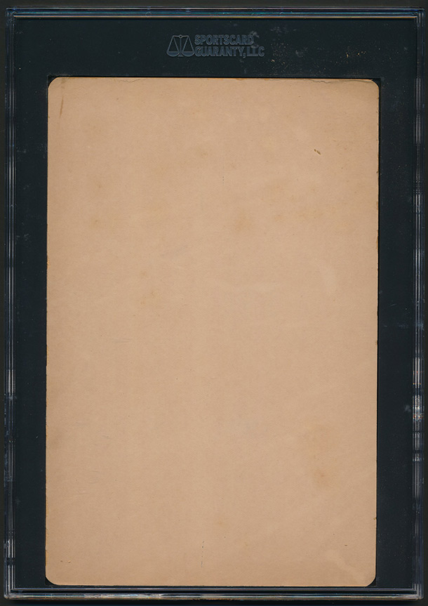 The edging has remained intact, and no obtrusive  creasing and/or surface blemishes are evident. Accounting for the technical  grade is the negligible ink remnant near the upper left edge and an upper right  corner diminutive crease, with both of these modest flaws rendered virtually  irrelevant versus the card's outstanding aesthetics. Only minimal edge/corner  wear is noted, with the four corners exhibiting a super eye pleasing  uniformity. The final compliments are the relatively clean surfaces, the bold  "Honest – E.J. DELEHANTY – NEW YORK" verbiage situated along the  lower border (misspelled "Delehanty"), and a blank flipside free of  any glaring blemishes. Of utmost significance, Delahanty's awe-inspiring  central image is a magnificent testament to baseball's storied past, truly worthy  of a final resting place in Cooperstown, New York. One of the most breathtaking  cards from any century, its "highest graded" stature, unquestionable  paucity level (only 8 encapsulated examples) and absolutely brilliant "Big  Ed" illustration all combine to place this 19th century "Holy  Grail" as one of the most momentous cabinets in the hobby!