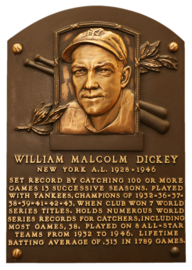 | Catcher of 100 or more games for 13 consecutive seasons, in 1936 Bill Dickey hit .363, still a record for the position.  He accumulated a .313 batting average and 1,209 RBI in his career.  During his 17 years, the Yankees won nine pennants and captured eight world championships.  Dickey is credited with developing the receiving skills of another Hall of Famer, Yogi Berra. |