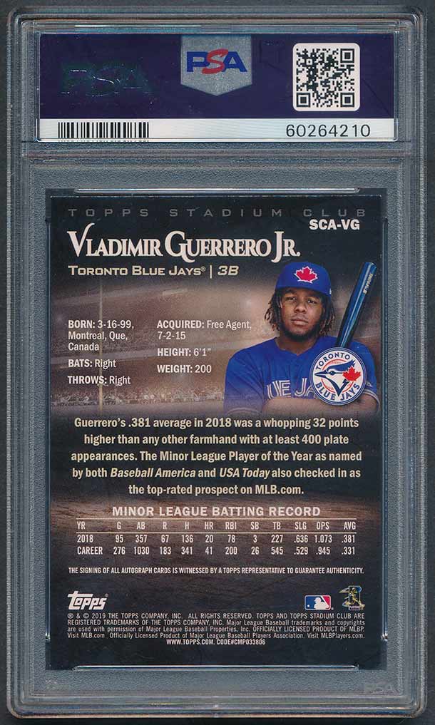 2019 Stadium Club Autographs Vladimir Guerrero Jr. #VG PSA 8 NM-MT