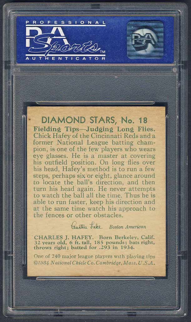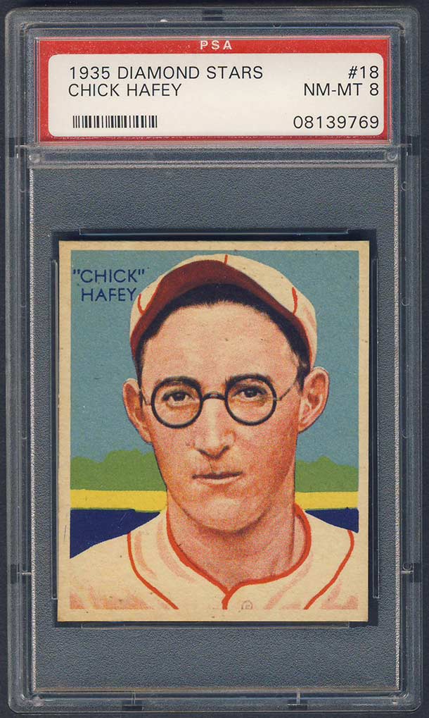 UPDATE: On November 5th, 2015 I checked the Heritage Auctions website to review their latest offering. As I reviewed each lot, I ended up tracking 17 different lots ending later that evening including an N28 Comiskey SGC 84, a N43 Ewing PSA 6, an E90-2 Wagner PSA 6, a 1914 Cracker Jack Plank PSA 7, and a 1952 Topps Eddie Mathews SGC 84. All of these were potential upgrades for my collection, but not within the budget for this auction. Two other cards caught my eye – a 1935 Diamond Stars Hafey PSA 8 and a 1950 Drakes Reese SGC 88. I placed some bids in order to participate in the extended bidding frenzy. The Hafey colors popped and the centering was a lot better than my PSA 7. I've been looking for an upgrade since 2007. In the past eight years, several NM-MT have been made available with prices ranging from $737-$1343. With the centering and color, this one was a steal at $525.80! It reminds me of an old photograph of my grandfather: