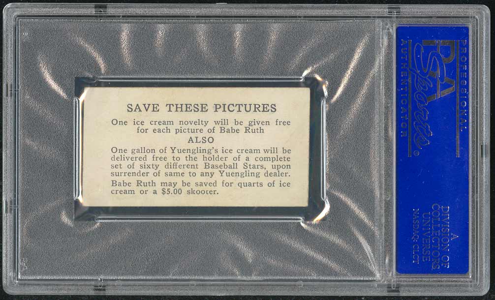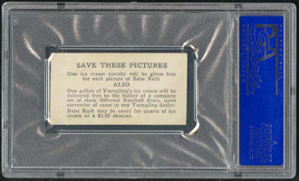 Issued in 1928, the Yuengling's Ice Cream issue consists of 60 black-and-white cards measuring 1-3/8" X 2-1/2". The photos are similar to those used in the E210 and W502 sets. Other ice cream companies such as Harrington's and Tharp's produced nearly identical cards. Two types of cards are seen, though whether either or both can be found for all players us unknown. Besides typographical placement differences on front, the back of one type mentions a "$5.00 skooter" as a redemption, while the other type has no mention of the toy. Collectors could redeem an entire set of Yuengling's cards for a gallon of ice cream. |