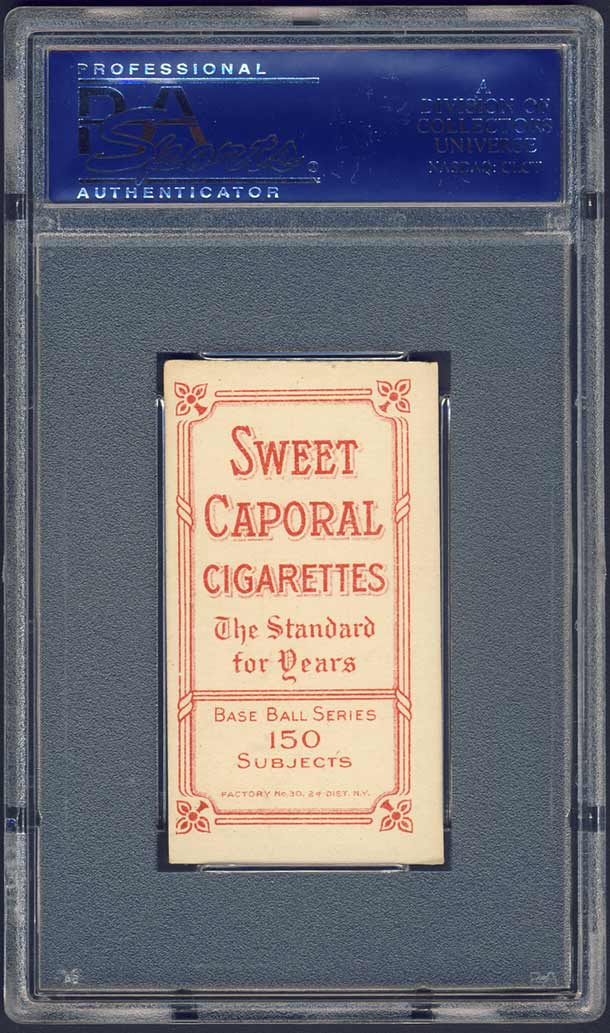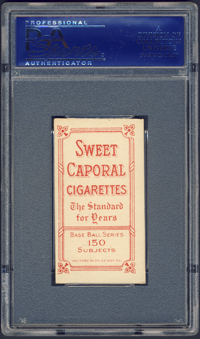 The nearly 525 cards which make up the T206 set are the most popular of the early tobacco issues. Players are depicted in color lithographs surrounded by a white border. The player's last name on the -7/16" X 2-5/8" cards appears at the bottom with the city and league, when a city had more than one team. Backs contain an ad for one of 16 brands of cigarettes. There are 389 major leaguer cards and 134 minor leaguer cards in the set, but with front/back varieties the number of potentially different cards runs into the thousands. The set features many expensive cards including a number of pose and/or team variations. |