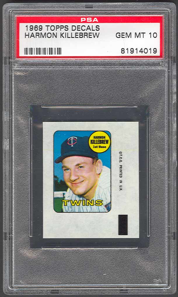 Designed as an insert for 1969 regular issue card packs, these decals are virtually identical in format to the '69 cards. The 48 decals in the set measure 1" X 2-1/2", although they are mounted on white paper backing, which measures 1-3/4" X 2-1/8". In March, 2001 a hoard consisting of two original 10,000-piece rolls - 833 each of half the players in the set - was sold at auction. |