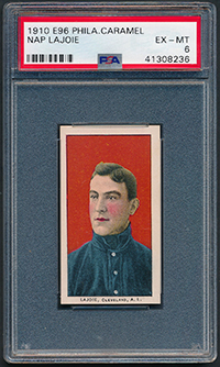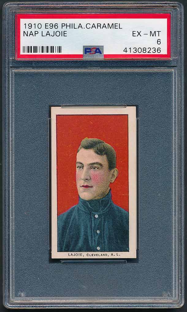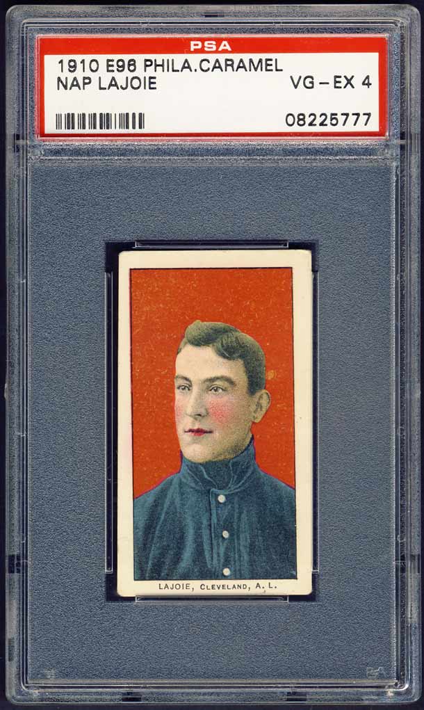 UPDATE: After 10+ years of waiting - I swung and hit a home run. When one of the best graded examples of a card in the world comes up in auction sometimes you got to go for it. I couldn't pass up the opportunity to purchase a PSA 6 of this card when it was offered up by Heritage Auctions in Sept, 2020. There's only five E96 Lajoie's in the world graded EX-MT by PSA with none higher. The color on this card was dripping off the edges and the corners looked NM+. It looked beautiful and once in hand, the card did not disappoint. The card looks as nice as the day it came out of the caramel package. Honestly, I don't see the flaws which kept it from receiving a higher grade - just a fantastic example. Check out the color of the front/back against the "4" example....night and day difference! |