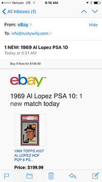 UPDATE: I had just arrived to work at the client office in Warsaw, IN. around 8:45am and unlocked my iPhone to check emails. With eBay alerts I’ve been directed towards newly listed auction items for several years, but I don’t recall them ever leading to a pickup for my baseball collection. On April 7th, 2016 my phone kicked back the following message: