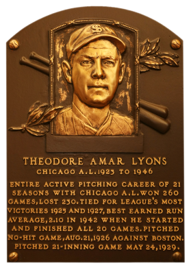 | Ted Lyons had the misfortune of pitching for the White Sox during some of the worst years in the history of the franchise. Inducted in 1955, he won 260 games lifetime, with 356 complete games and 27 shutouts. He led the AL in shutouts twice and wins twice. In 1942, he led the AL with a 2.10 ERA. At age 42, he served three years in the Marines during World War II, then returned to baseball for one last season in 1946, going 1-4 despite a 2.32 ERA. He managed the Sox through '48. |