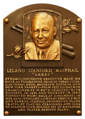 | As an executive with the Reds, the Dodgers, and the Yankees, Larry MacPhail played a part in virtually every baseball development between the wars. He brought air travel and lights to the major leagues in 1935, and radio broadcasts to Brooklyn in 1938. He was inducted in 1978. MacPhail's son and grandson, Lee and Andy, followed him as baseball executives. |