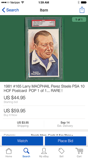 my first Perez-Steele Larry MacPhail postcard on eBay in December,