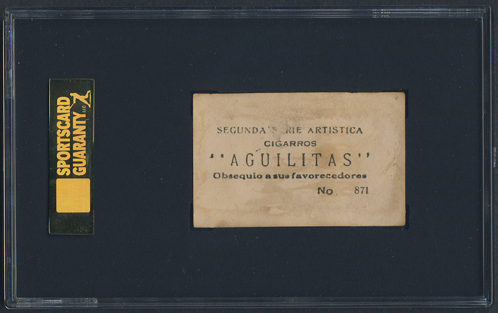 This set is known to collectors as Aguilitas Segundas for the top line of the ad on the back. In reality, this second series cigarette card issue was issued several years before the Aguilitas first series counterpart. About 1-1/2" x 2-3/8", the cards have round black-and-white player portrait photos in a debossed rectangular area on glossy stock. Beneath the photo is a player name or nickname, with "BASE BALL" below. The ballplayers are a subset of a 900-card issue which included movie and stage stars, soccer players, boxers and other subjects. All baseball players are known within the numerical range of 841 through 899, though only four cards are known above #880, and none between #880-895. The known ball-players comprise of 44, many of whom were stars of the Negro Leagues, including several Hall of Famers and some who appear on no other career-contemporary cards. Many surviving specimens show evidence of having been glued into an album which largely accounts for their survival in the area's hot, humid climate. Examples are rarely seen in condition approaching Excellent. |