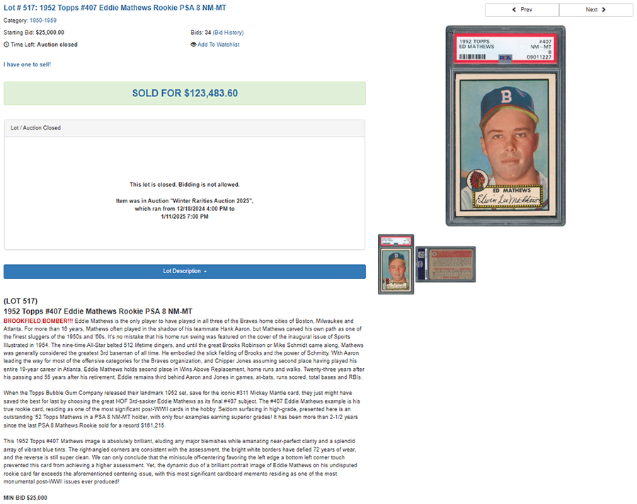 of Eddie Mathews was a 1967 Topps PSA 8 purchased way back in December,