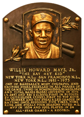 | Willie Mays could do everything: hit, field, and run. While the Giant center fielder's 660 home runs ranks in the top-5 all-time, his magnificent over-the-shoulder catch of Vic Wertz's blast to center field in the 1954 World Series has become the standard against which all other catches are compared. "The Say Hey Kid" led the NL in slugging percentage five times, homers and stolen bases four times, triples three times, and runs scored twice. He had 3,283 career hits, a .302 batting average, a .557 slugging percentage, 1,903 RBI, and 2,062 runs scored. |