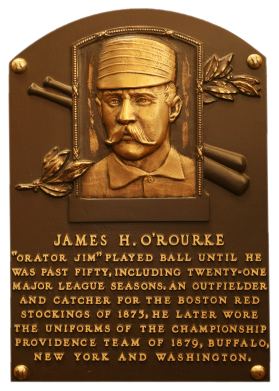| In 1876, O'Rourke collected the first base hit in NL history, one of 2,304 he'd gather for his career. A lifetime .310 hitter, O'Rourke's manner of speaking earned him the nickname "Orator Jim". |