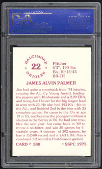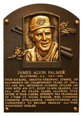 | Ace of Baltimore's powerful teams of the 1970s, Jim Palmer won 20 games eight times on his way to three Cy Young Awards and 268 career wins. He led the AL in ERA twice and in innings pitched four times. He had a career 2.86 ERA, 2,212 Ks, and 1,311 walks in 3,948 innings pitched. |