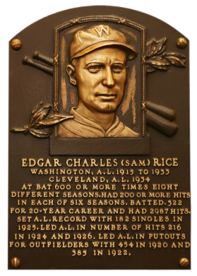 | Sam Rice, a fleet 150-pounder, smacked 2,987 hits on his way to a .322 career average for Washington. He led the AL in hits twice and had 200 or more base hits six times. He scored 1,515 career runs and stole 351 bases. A master of bat control, Rice struck out only nine times in 616 at bats in 1929. |