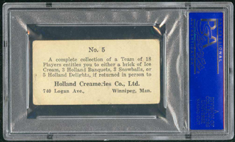 The World's Champion Washington Senators were featured on a set issued in Winnipeg, Manitoba,of all places. The 1-1/2" X 3" cards have player portrait photos printed in blue on front. The black printed back has a card number and details of a redemption offer of cards for ice cream. Like many such offers it appears as if card #16 was intentionally withheld or minimally distributed, making it very scarce today. |