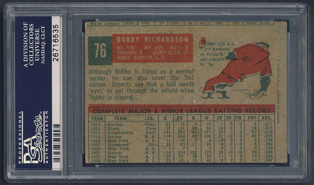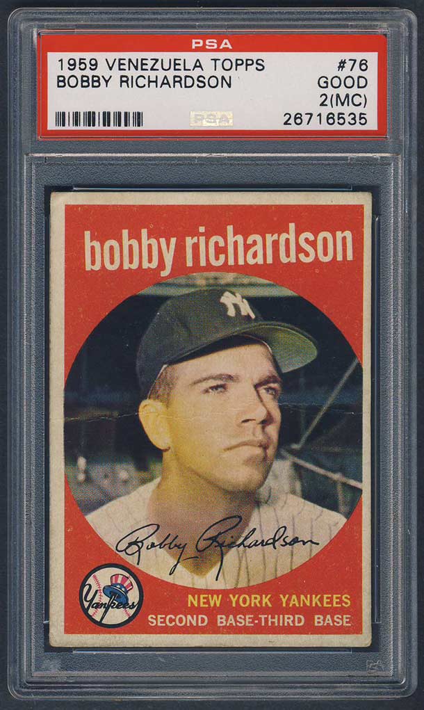 Beginning in 1952, after the MLB season ended, Topps began shipping US Topps high-numbered cards down to Venezuela. This continued each year through 1958 and proved successful enough for Topps to license a parallel set to be produced and distributed in Venezuela. In most years, such as the debut set in 1959, the cards destined for the South American market represented a parallel of the first couple series of Topps' regular U.S. issue. Print quality (usually lack of gloss on front) is the major difference between the two issues. Backs of some of the 1959 Venezuelan cards carry the credit line: "Impreso en Venezuela por Benco C.A." The cards were issued in two series - the first series (1-110) and the second series (111-198). The set used two different trademarks on the cards, with half of the set getting a Spanish trademark, the other half getting the US Topps trademark. A reality of the Venezuelan cards is that they tend to survive in low-grade condition due to the local custom of gluing cards into albums and scrapbooks. After its 1959 issue, Topps produced Venezuelan cards only in the even-numbered years, except for 1967, until the last of the sets was issued in 1968. |