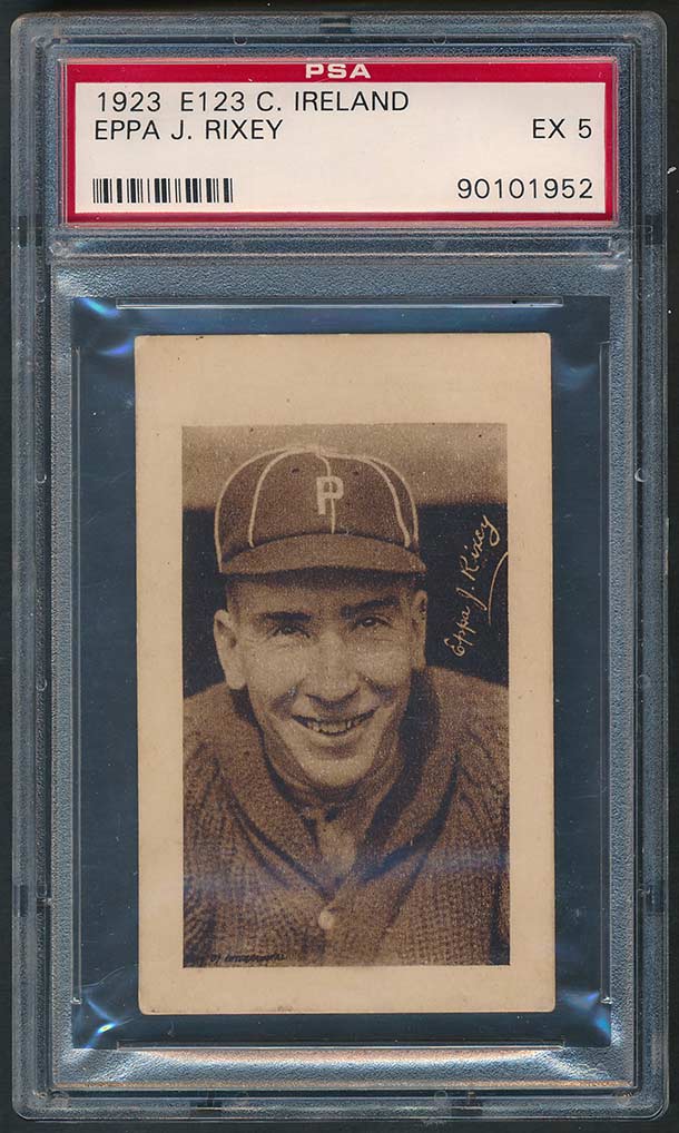 Note the "P" on Rixey's hat in the E123 issue and missing from the Exhibits examples. Obviously, the Exhibit Supply Company wasn't licensed to tie their product to MLB-Philadelphia Phillies but the Curtis Ireland Candy Corp had exclusive rights to the photo. It's a great example of leveraging early "Photoshop" technics to hide the truth. |