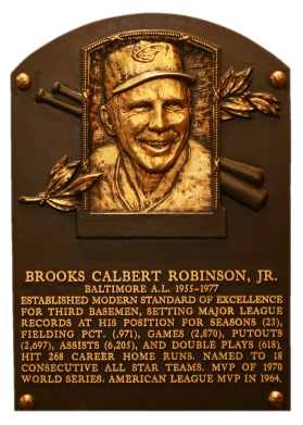 | One of the greatest fielding third baseman ever, Brooks Robinson won the Gold Glove 16 times in 23 seasons. The AL MVP in 1964, Brooks turned in a .317 average, 28 homers, and a league-leading 118 RBI. He sparkled in postseason play, posting a .348 average in 18 ALCS games. In the 1970 World Series, he led the Orioles over the Reds, hitting .429 and turning in one spectacular fielding play after another. He had 268 career homers, 1,357 RBI, and 1,232 runs. |