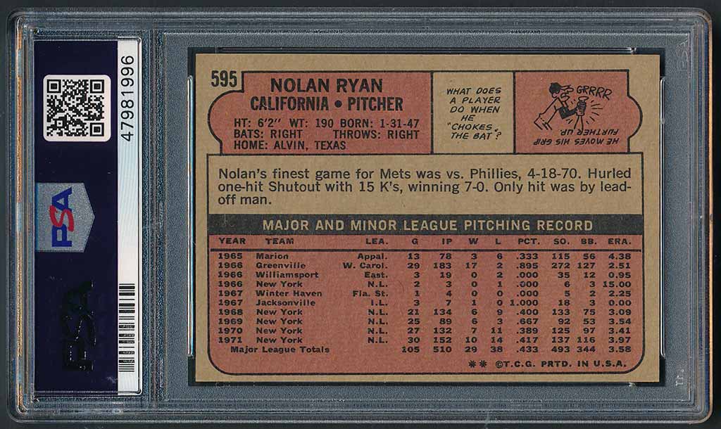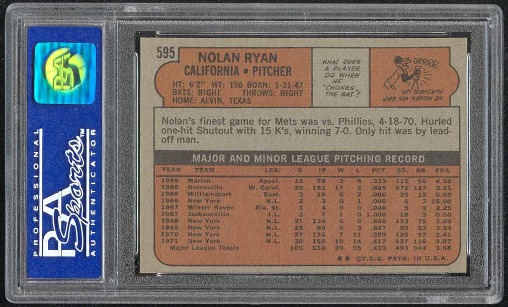 buying a 1972 Topps Nolan Ryan at a show in the mid-1990s. I submitted the card to PSA and it came back graded NM. I sold the PSA 7 in May,