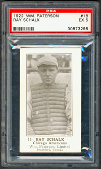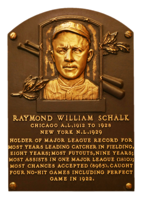 | Although Schalk's career average was .253, few complained when he was elected to the Hall of Fame. A superb catcher, Ray's game was defense. In 1920, he caught four 20-game winners for the White Sox, and four no-hitters, more than any other catcher. He holds the AL record for assists by a catcher (1,811). Untainted by the 1919 Black Sox scandal, "Cracker" went on to play another decade. |