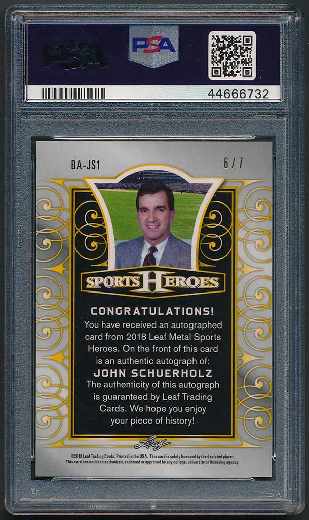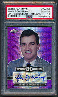 Comments: I've been looking for a '81/'82/ or '83 Royals Team card of John Schuerholz but it's been impossible to find. I've not seen an example - raw or graded - anywhere for 5+ years. So, I started searching for other cards of the man in a portrait pose. On August 23, 2019 I found a tribute autographed card that fit the bill...a 2018 Leaf Metal Sports Heroes purple refractor and won the item for a bid of $21. In late 2019, I submitted the card to PSA and I scored a perfect '10' rating. Here's the card: