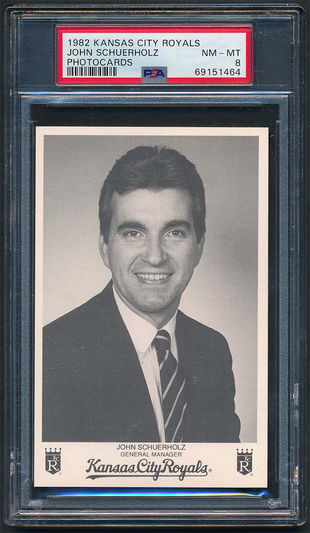 UPDATE: In early 2021, I finally found a raw example of an '82 Royals Team Photocard Schuerholz on eBay. The card was in VG condition. A couple months later another one popped up and I snagged that one as well. When it arrived, the item was in much better condition than I anticipated....NM+++! I was ecstatic. Now, it's time to get it sent off to PSA to see if they agree...