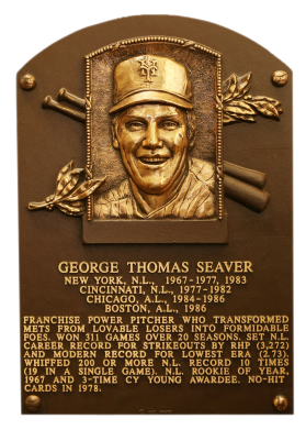 | In 1992, Tom Seaver was named on a record 98.8 percent of ballots for enshrinement, indicating his stature among fans. A three-time Cy Young winner (1969, '73, and '75), he also finished second twice and third once. "Tom Terrific" led the Mets to a miracle world championship in 1969. He won 311 games and struck out 3,640 batters, and his .603 winning percentage was the best of any 300-game winner since Lefty Grove retired in 1941. |