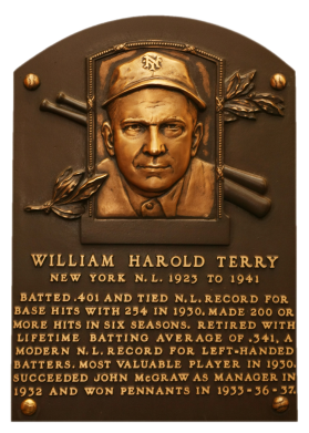 | A career .341 hitter, Bill Terry was the last National Leaguer to hit over .400, batting .410 in 1930 with an amazing 254 hits. "Memphis Bill" had more than 100 RBI from 1927 to 1932. Showing long-ball power when he wanted, Terry smashed 28 homers in 1932. Generally, though, his strengths were doubles and triples. A fine defensive first baseman, he took over as Giant manager in 1932 and led the team to three pennants. |