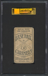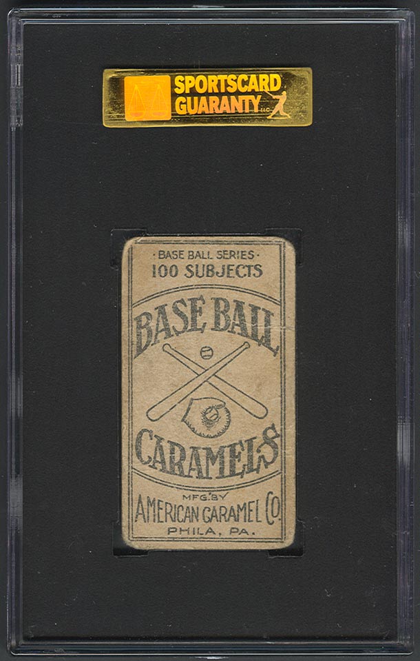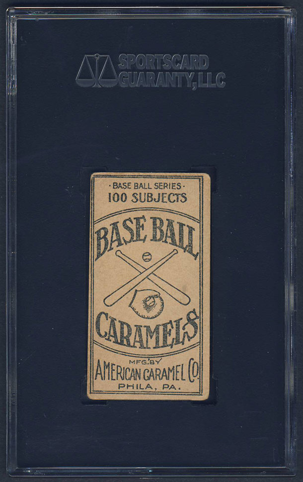 Closely related to the E90-1 American Caramel set, the E90-2 set consists of 11 cards featuring members of the 1909 champion Pittsburgh Pirates. The cards measure 1-1/2" X 2-3/4" and display a color lithograph on the front with a solid color background of either red, green blue or pink. The player's name and "Pittsburg" appear in blue capital letters in the border beneath the portrait. The backs are identical to those in the E90-1 set, depicting a drawing of a ball, glove, and crossed bats with the words "Base Ball Caramels" and a reference to "100 Subjects". |