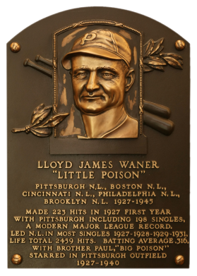| "Little Poison," to older brother Paul's "Big Poison," Lloyd Waner was to the single what Babe Ruth was to the home run. In 1927, Waner's rookie year, the little leadoff man hit 198 one-baggers. He used his speed to cove the vast Forbes Field outfield, leading the NL in putouts four times. Waner had a .316 career batting average, 2,459 hits, and 1,201 runs scored. |