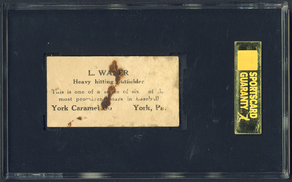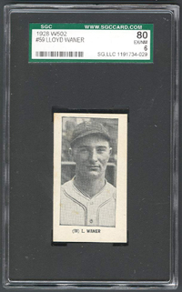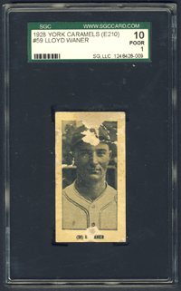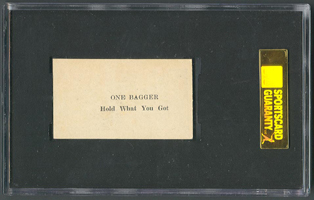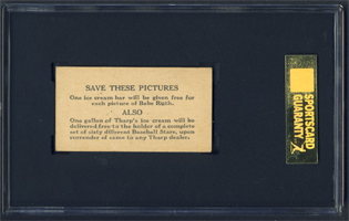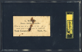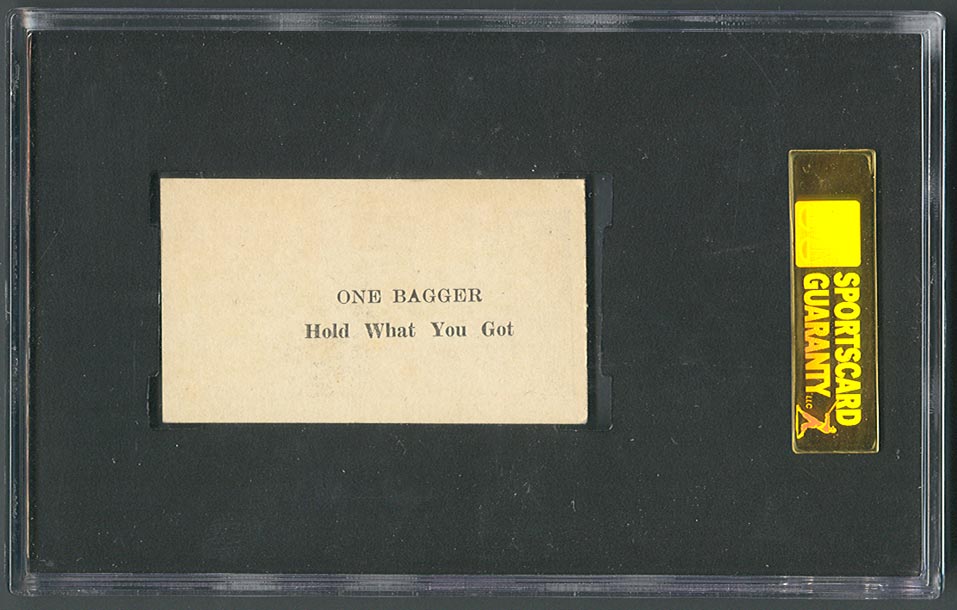 Issued in 1927, this 63-card set is closely related to the York Caramel set (E210) of the same year. The black-and-white cards measure 1-3/8" X 2-1/2" and display the player's nameat the bottom in capital letters preceded by a number in parentheses. The backs of the card read either "One Bagger," "Three Bagger" or "Home Run", and were apparently designed to be used as part of a baseball game. |