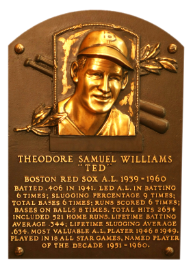 | Ted Williams one desire was to walk down the street and have people say, "There goes the greatest hitter that ever lived." Arguably, he was. Despite missing nearly five years to the military, the Red Sox left fielder won two MVP Awards, six batting and four home run titles, and two Triple Crowns. "The Splendid Splinter" batted over .316 in each of his 19 seasons except one. In 1941, "The Kid" hit a .406 mark. He's the last player to attain that plateau. He had 30 or more homers in eight seasons, 20 ore more in 16 seasons. "Teddy Ballgame" retired with a career average of .344, 2,019 walks, 521 home runs, and 1,839 RBI. |