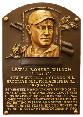 | For five seasons, from 1926 to 1930, the muscular, midgetlike Wilson was one of the game's greatest sluggers. In 1930, the Cub outfielder hit an NL-record 56 homers and knocked in a major league record 190 runs. He led the NL in homers four times and in RBI twice. Liquor, nonetheless, was Wilson's downfall, and by the end of 1934, he was out of baseball. |
