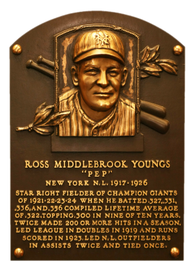 | Ross Youngs was a star on four straight pennant winners for John McGraw's Giants in the early 1920s. He soon was McGraw's favorite and one of the game's best hitters. On the verge of greatness, in 1925 Youngs's skills deserted him and his average fell nearly 100 points. Diagnosed with Bright's disease, a terminal kidney disorder, Youngs gamely played one more season and died in 1927. He had a .322 career batting average with 1,491 hits and 812 runs scored. |