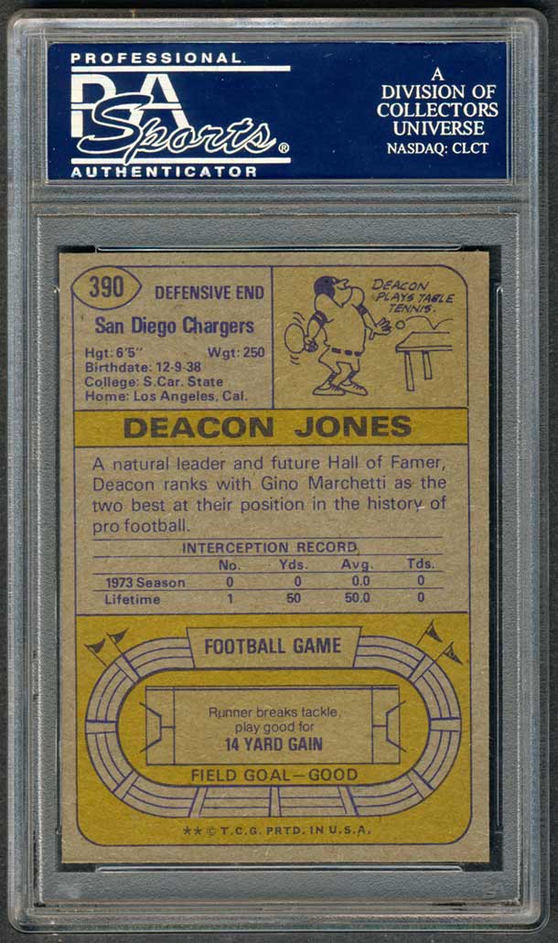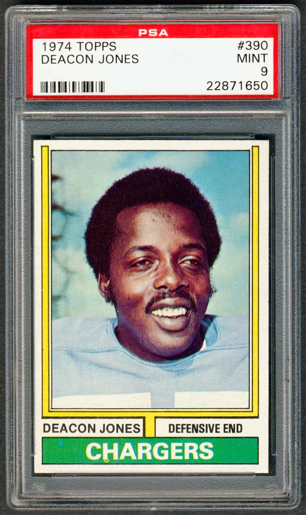 HOFer Deacon Jones is shown on this card graded MINT by PSA.